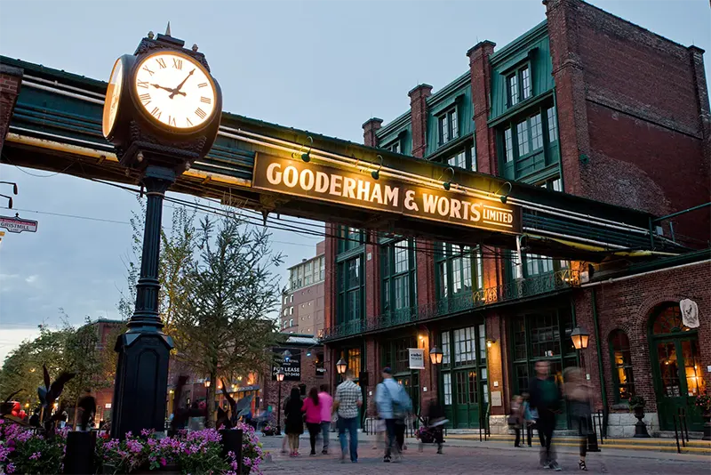 Distillery Historic District là khu phố cổ được cải tạo từ nhà máy rượu whisky thế kỷ 19, nay trở thành trung tâm văn hóa và nghệ thuật nổi tiếng. Với kiến trúc gạch đỏ cổ điển, quán cà phê, phòng trưng bày, nhà hàng và cửa hàng thủ công độc đáo, nơi đây mang đậm hơi thở châu Âu giữa lòng Bắc Mỹ.